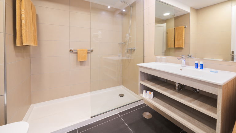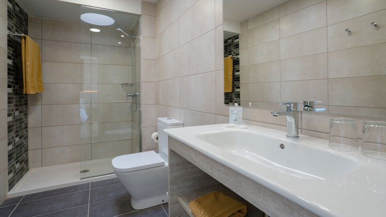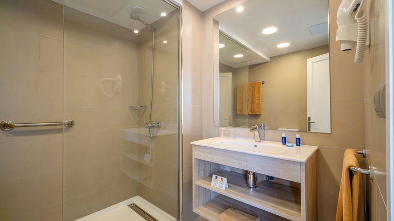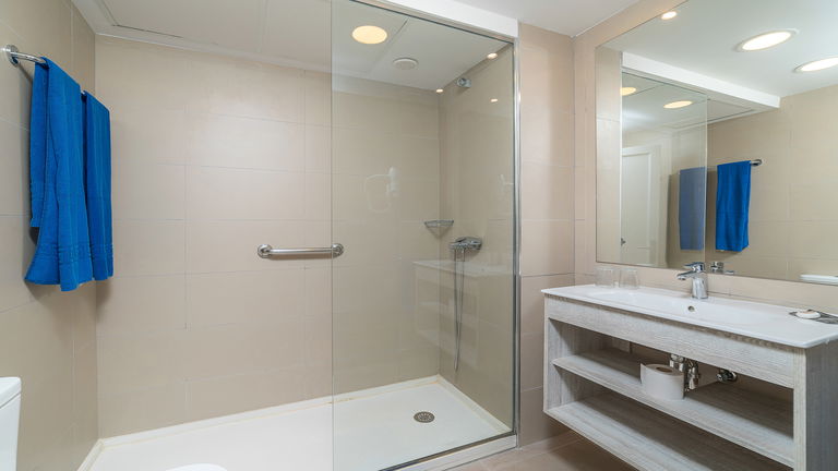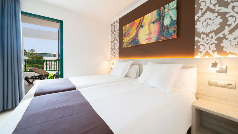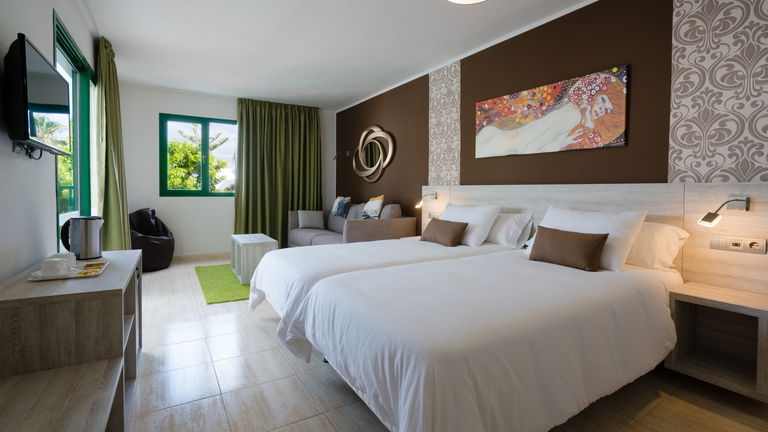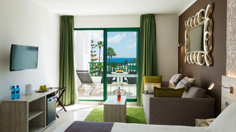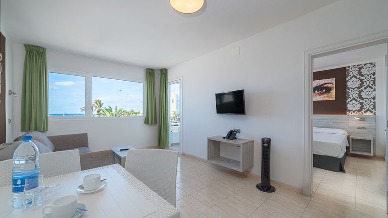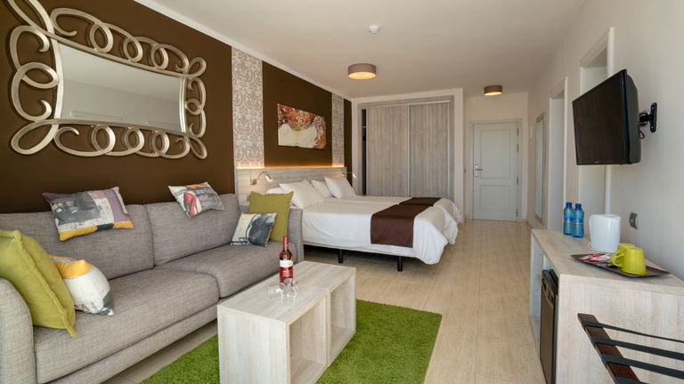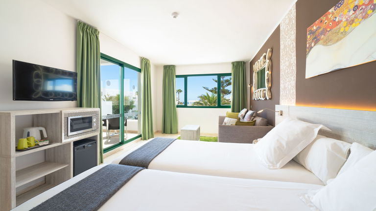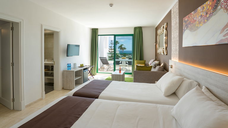 Amplias y confortables suites de estilo moderno. Su distribución, de concepto abierto, alberga un dormitorio abierto con sala de estar y salida a la terraza privada. Adicionalmente, cuenta con un segundo dormitorio independiente con 2 camas individuales. Nuestras suites tienen un baño con ducha efecto lluvia y no cuentan con cocina. Al alojarte encontrarás un minibar, microondas y hervidor de agua. En su terraza privada podrá tomar el sol disfrutando de unas maravillosas vistas a la piscina principal del complejo. Estas suites no disponen de ascensor.